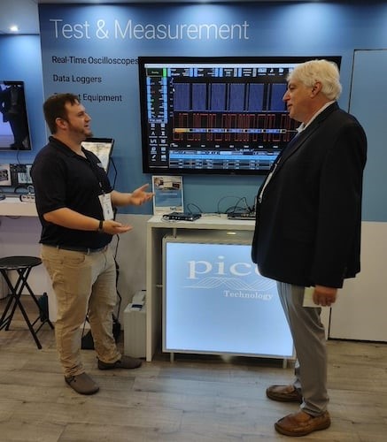 Главный редактор All About Circuits Джефф Чайлд (справа) беседует с инженером по техническим приложениям Pico Technology Беном Эллисом (слева) на выставке Embedded World 2024.