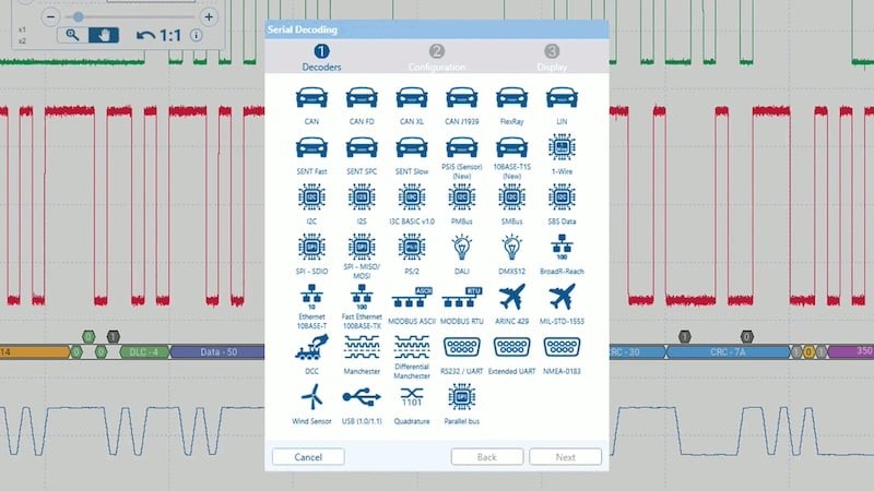 Программное обеспечение PicoScope 7 предпринимает действия, чтобы сделать декодирование последовательных протоколов более простым и универсальным. PicoScope включает 40 декодеров протоколов. Протоколы можно выбирать из упрощенного пользовательского интерфейса, а также отображать и анализировать вместе с другими функциями сигналов.