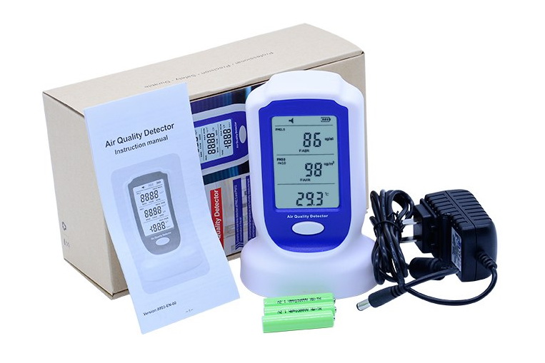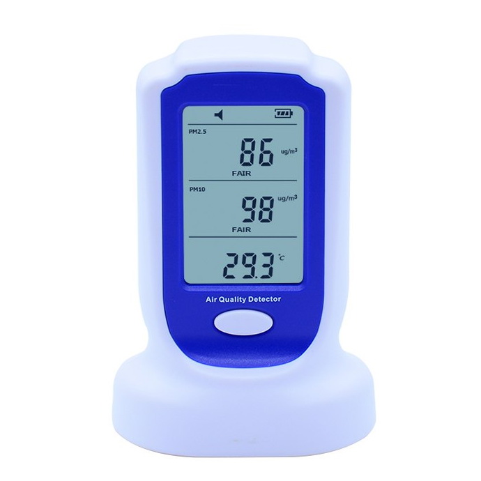 GM8803 - портативный анализатор анализатор концентрации мелкодисперсных твёрдых частиц произодства компании Benetech. Предназначен для контроля качества воздуха и детектирования твёрдых мелкодисперсных частиц, пыли и других включений в составе воздуха. Используется в офисных помещениях, медицинских, образовательных учреждениях, в местах скопления и пребывания людей. Прибор имеет два канала для анализа твердых мелкодисперсных частиц: до 10 мкм и до 2,5 мкм. Отличительной чертой данного портативного настольного анализатора концентрации твёрдых частиц GM8803 являются высокая точность измерения, большой дисплей, на котором отображается концентрация частиц размером до 2,5 мкм, до 10 мкм, температура и влажность воздуха, а так-же реализована цветовая сигнализация зон допустимой концентрации частиц. Работа анализатора GM8803 основана на технологии лазерной фотометрии рассеянного света. Минимальное разрешение размера частиц 0,3 мкм. Питание анализатора обеспечивают три аккумулятора типа ААА (NiMH).