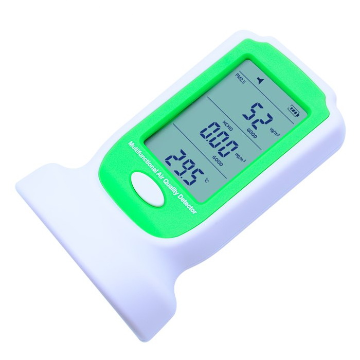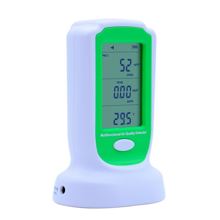 GM8804 - портативный анализатор концентрации формальдегида и твёрдых частиц произодства компании Benetech. Предназначен для контроля качества воздуха, концентрации формальдегида и детектирования твёрдых мелкодисперсных частиц, пыли и других включений в составе воздуха. Используется на производстве, в офисных помещениях, медицинских, образовательных учреждениях, в местах длительного пребывания людей. Прибор имеет два канала для анализа твердых мелкодисперсных частиц: до 10 мкм и до 2,5 мкм и канал измерения концентрации формальдегида. Отличительной чертой данного портативного настольного анализатора GM8804 являются высокая точность измерения, большой дисплей, на котором отображается концентрация частиц размером до 2,5 мкм, до 10 мкм, концентрация формальдегида, температура и влажность воздуха, а так-же реализована цветовая сигнализация зон допустимой концентрации. Работа анализатора GM8804 основана на технологии лазерной фотометрии рассеянного света. Минимальное разрешение размера частиц 0,3 мкм. Питание анализатора обеспечивают три аккумулятора типа ААА (NiMH).