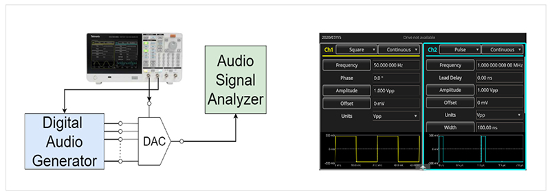 • Для управления тактовым сигналом ЦАП и управления аудиогенератором с помощью двухканального генератора произвольных функций каналы 1 и 2 должны работать в «несинхронизированном» режиме.