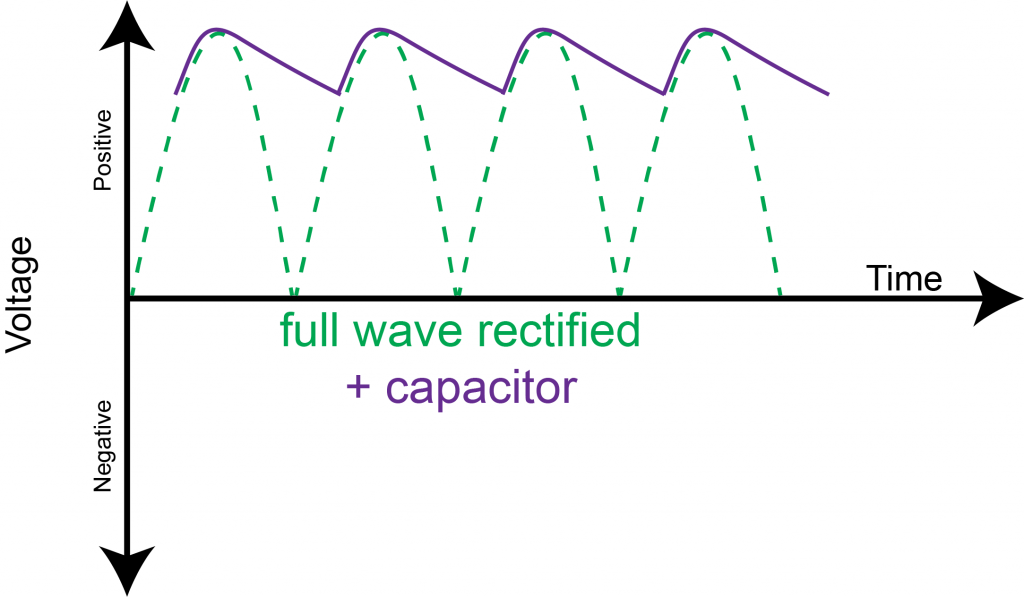 После выпрямления напряжения все еще остается флуктуация в форме волны — время между пиками — которую необходимо устранить. Затем выпрямленное переменное напряжение фильтруется или «сглаживается» конденсатором.