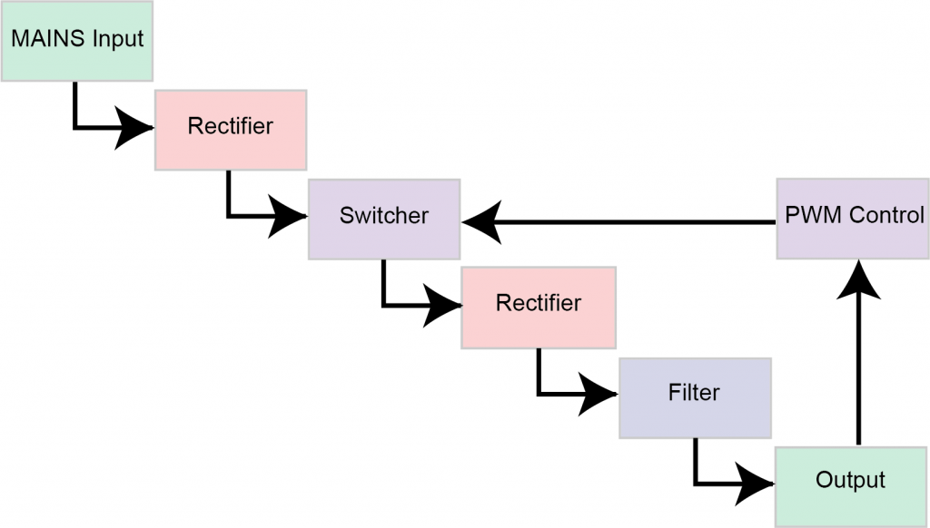 В регулируемых источниках питания схема непрерывно отбирает часть выходного напряжения и регулирует систему, чтобы поддерживать выходное напряжение на требуемом уровне. Во многих случаях включаются дополнительные схемы для обеспечения ограничений тока или напряжения, фильтрации шума и регулировки выходного сигнала.