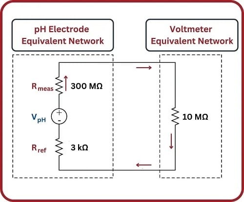Только небольшая часть напряжения стеклянного электрода (VpH) будет фактически видна на клеммах вольтметра из-за этого эффекта нагрузки. Мы можем рассматривать внутреннее сопротивление вольтметра 10 МОм как одно сопротивление в сети делителя напряжения, причём два сопротивления пробника являются двумя другими сопротивлениями делителя:
