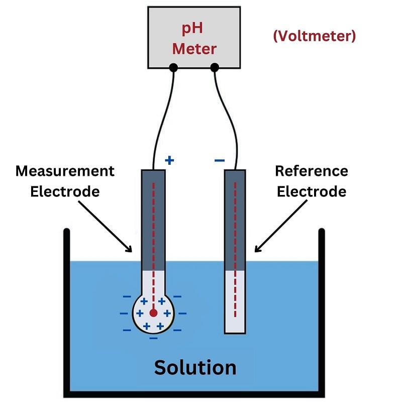 Ионы водорода в жидком растворе проникают в круглую стеклянную колбу измерительного электрода, создавая разность потенциалов, приблизительно равную 59 милливольт на единицу pH отклонения от 7 pH (нейтрального). Электрод сравнения служит простой цели замыкания электрической цепи от клемм вольтметра к обеим сторонам стеклянной колбы (внутри и снаружи).