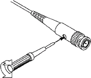 1. Установите коэффициент затухания пробника в меню как 10X и переключателя в пробнике как 10X (см. «Как установить коэффициент затухания зонда» на стр. 14 Инструкции по Эксплуатации) и подключите пробник к каналу CH1. Если используется наконечник крючка пробника, убедитесь, что он находится в тесном контакте с пробником. Подключите наконечник пробника к сигнальному разъему компенсатора пробнка и подключите зажим опорного провода к разъему заземляющего провода разъема пробника, а затем нажмите кнопку «Автонастройка».
