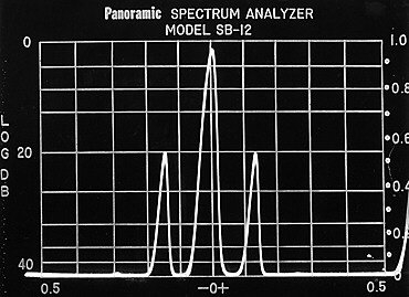 Анализатор спектра можно рассматривать как приёмник, который многократно и очень быстро настраивается в заданном диапазоне частот и отображает уровень сигнала на каждой частоте в виде кривой на экране. Вот пример отображения анализатора спектра: