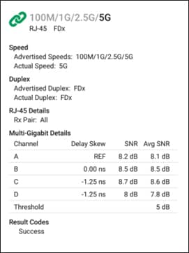 • Анализ силы сигнала: Тестеры с обнаружением соединения также могут поставляться с функциями, которые позволяют им анализировать силу сигнала на сетевом кабеле. В некоторых случаях это отчет о силе импульсного сигнала соединения; это может включать отношение сигнал/шум (SNR) и перекос задержки между парами, важные измерения для многогигабитных соединений (2,5 и 5 Гбит/с.)