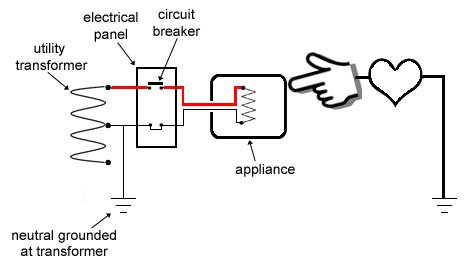 Если вы прикоснётесь к корпусу электроприбора, когда он находится под напряжением, вы можете замкнуть цепь на землю, и весь ток пойдёт через вас. Но через автоматический выключатель протекает слишком мало тока, поэтому он не сработает. Вероятность удара током велика. (Однако учтите, что без заземления ничего произойти не может. Для того, чтобы ток прошёл через вас, необходимо замкнуть цепь.) И помните, что электричество всегда стремится замкнуть цепь, поэтому ток короткого замыкания здесь попытается вернуться на заземлённую сторону трансформатора.