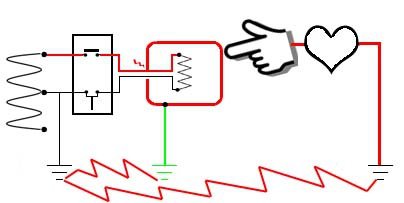 У нас есть зелёный заземляющий провод, идущий к нулевой шине в главном щите. У этого провода очень низкое сопротивление, поэтому электрический ток легко протекает по нему. Это также создаёт короткое замыкание, которое потребляет большой ток и, следовательно, приводит к срабатыванию автоматического выключателя. Именно этого мы и хотим — чтобы автоматический выключатель сработал. Обратите внимание, что вы всё ещё являетесь частью цепи. Но вы подключены параллельно заземляющему проводу, поэтому большая часть тока будет протекать по заземляющему проводу с низким сопротивлением.