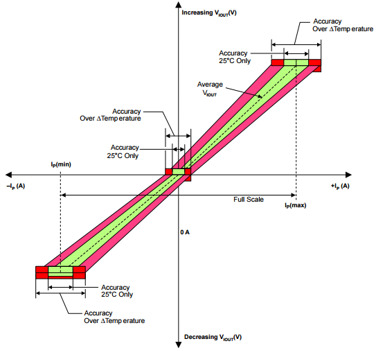 Напряжения, создаваемые эффектом Холла, очень малы, поэтому практические устройства включают схемы для формирования и усиления сигнала. Датчики Холла считаются не интрузивными, поскольку единственное сопротивление, вносимое в путь тока, — это сопротивление первичного проводника устройства — например, всего 1,1 мОм в Allegro ACS709. Взаимосвязь между выходным напряжением и измеренным током для этого конкретного устройства иллюстрируется следующим графиком:
