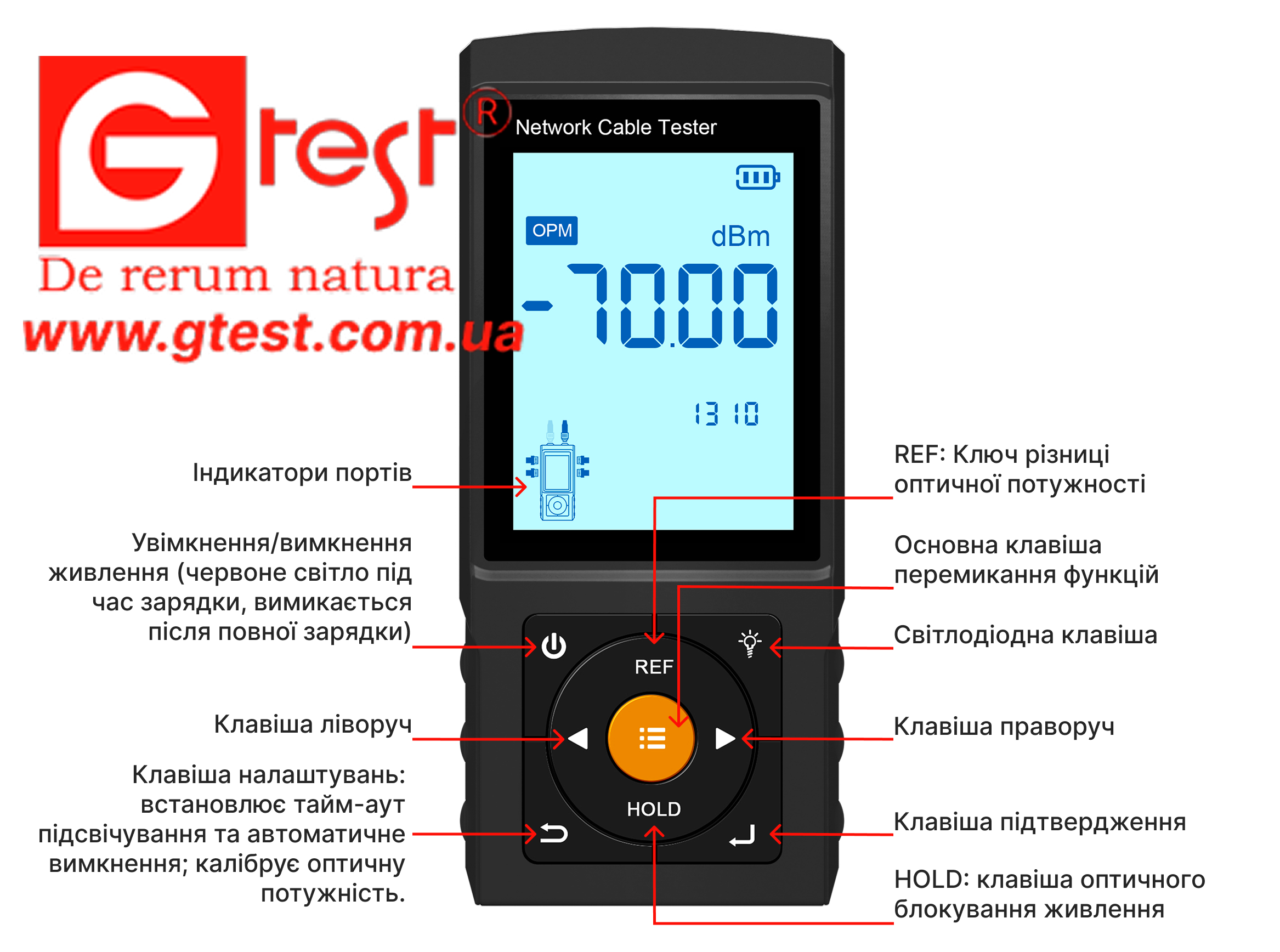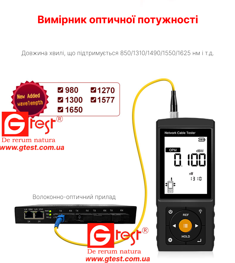 - Оптический измеритель мощности: Длина волны (нм): 850/980/1270/1300/1310/1490/1550/1577/1625/1650 нм. Диапазон мощности (дБм): от -70 до +6 дБм. *(опционально)