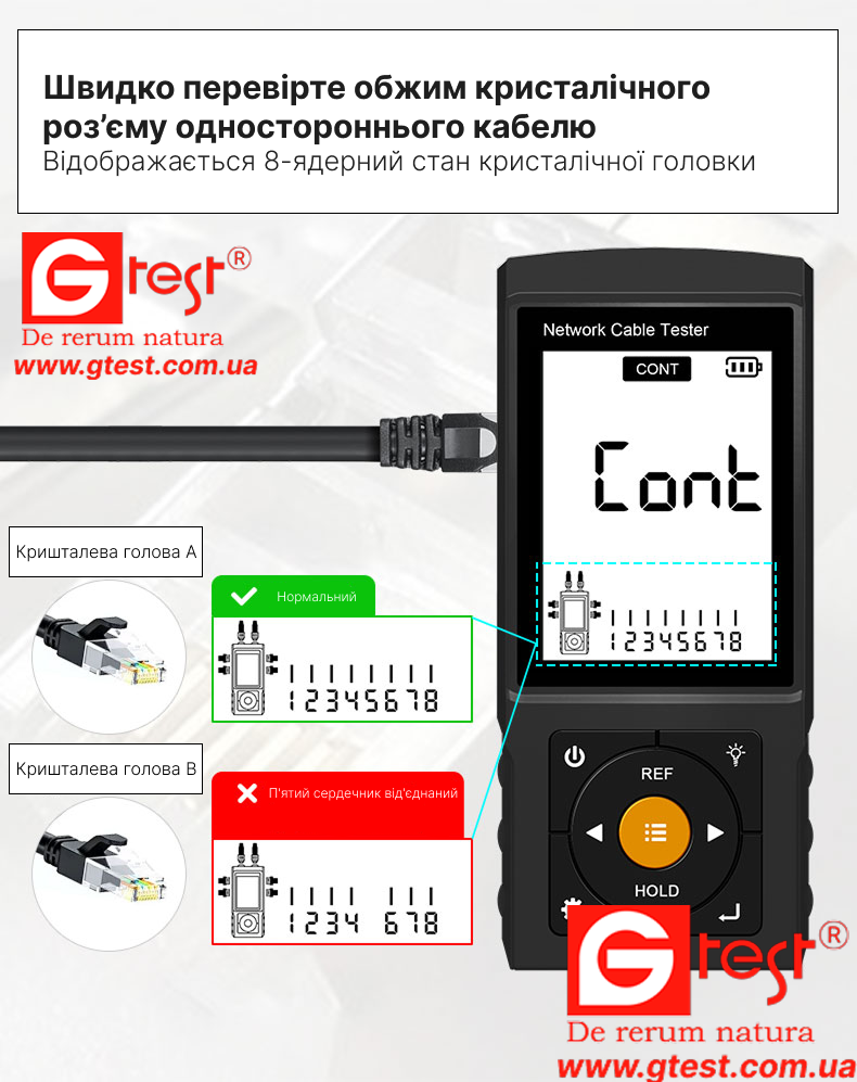 - UTP/тест непрерывности: проверяет цельность сетевого кабеля и обнаруживает обрывы, короткие замыкания и перекрестные соединения. Режим проверки правильного функционирования разъема RJ45.