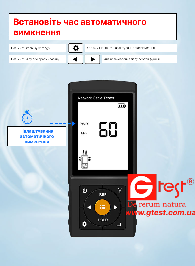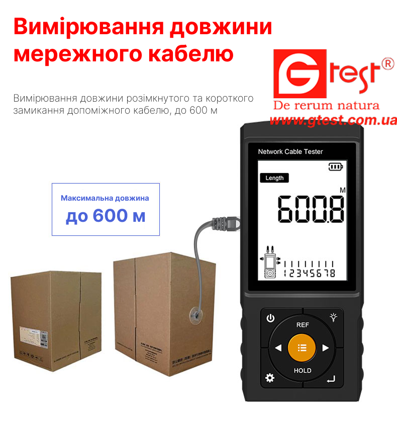 - Измерение длины кабеля: расстояния до обрывов/короткого замыкания сетевых кабелей от 1 до 600 метров.