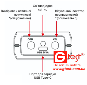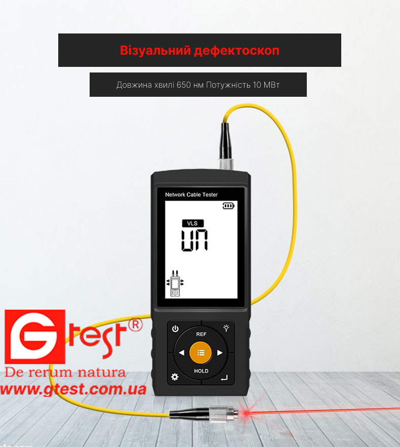 - Визуальный локатор неисправностей: выходная мощность 10 мВт, длина волны 650 нм, стабильный и импульсный режимы. *(опционально)