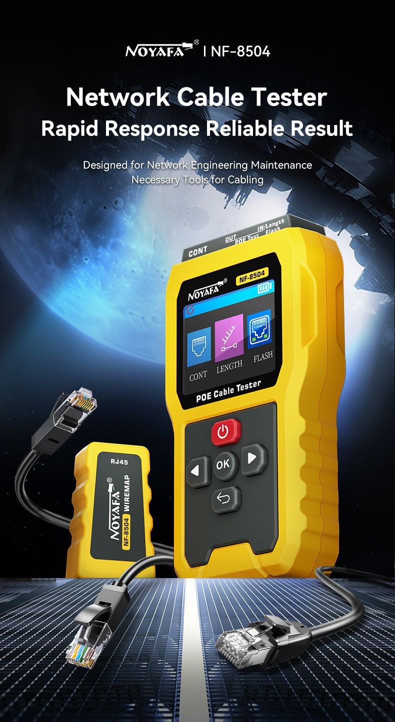 NF-8504 сочетает профессиональные функции с удобным дизайном. Он поддерживает трассировку кабеля RJ45/RJ11, отображение напряжения PoE и схему проводки — все на четком ЖК-экране. Идеально подходит как для новичков, так и для экспертов.