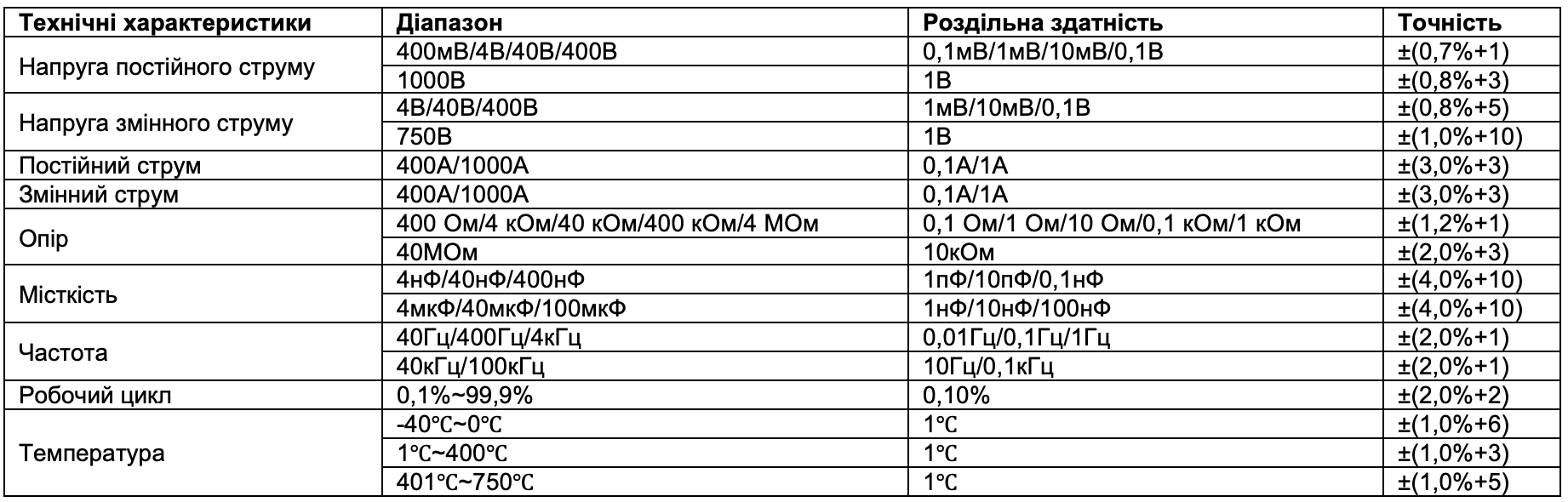 - Многофункциональные измерения: постоянное/переменное напряжение, постоянный/переменный ток, сопротивление, емкость, частота, рабочий цикл и температура.