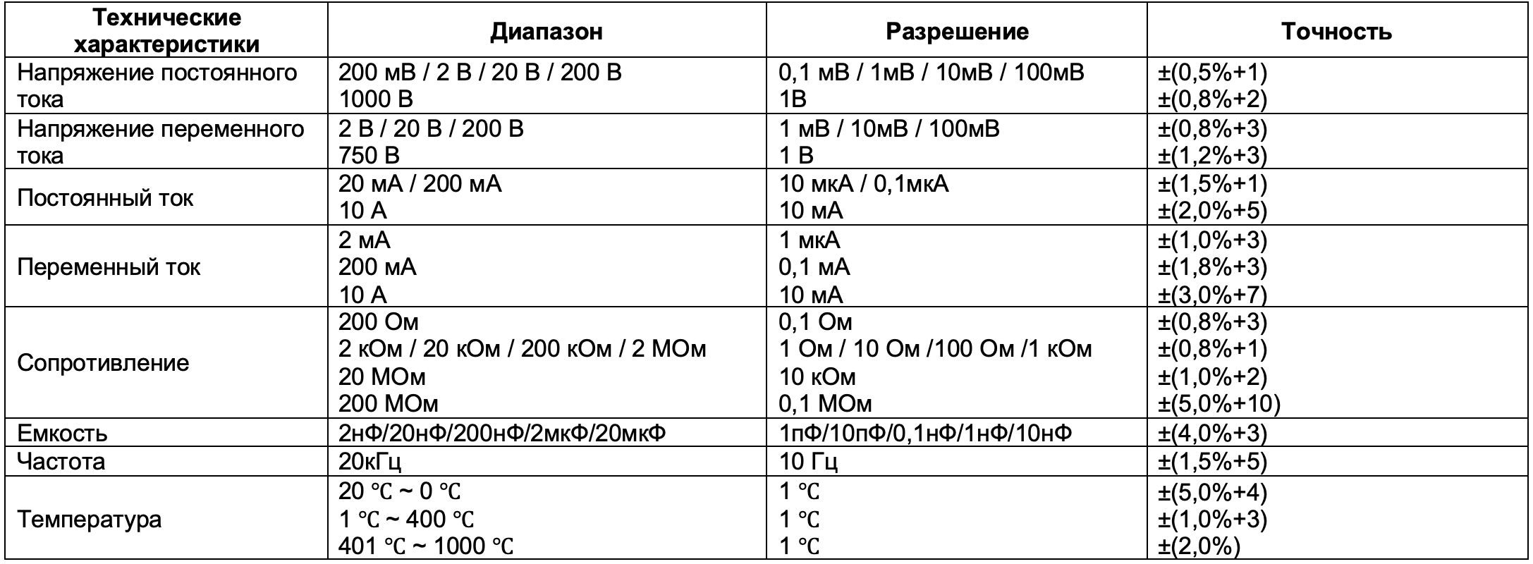 напряжение, ток, сопротивление, ёмкость, частота, температура