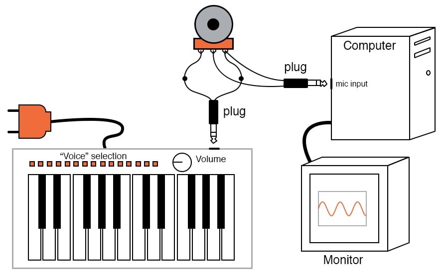 В этом эксперименте по поведению сигналов переменного тока используйте программу-осциллограф на базе ПК для наблюдения за формами сигналов с музыкальной клавиатуры и изучите основные принципы работы такого рода осциллографа.