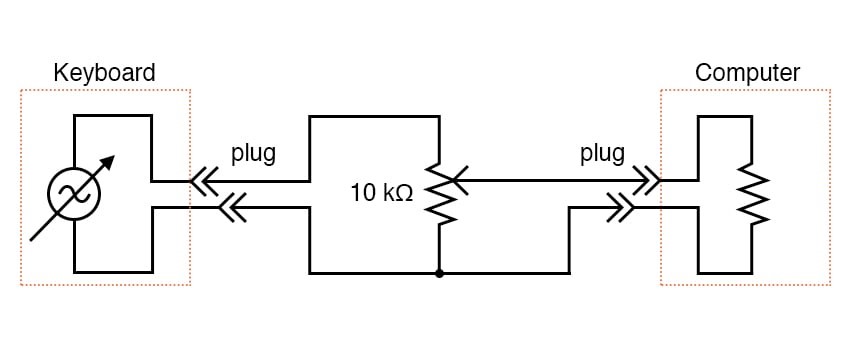 Рисунок 2. Принципиальная схема подключения выхода клавиатуры к входу звуковой карты ПК с регулируемым потенциометром усилением.