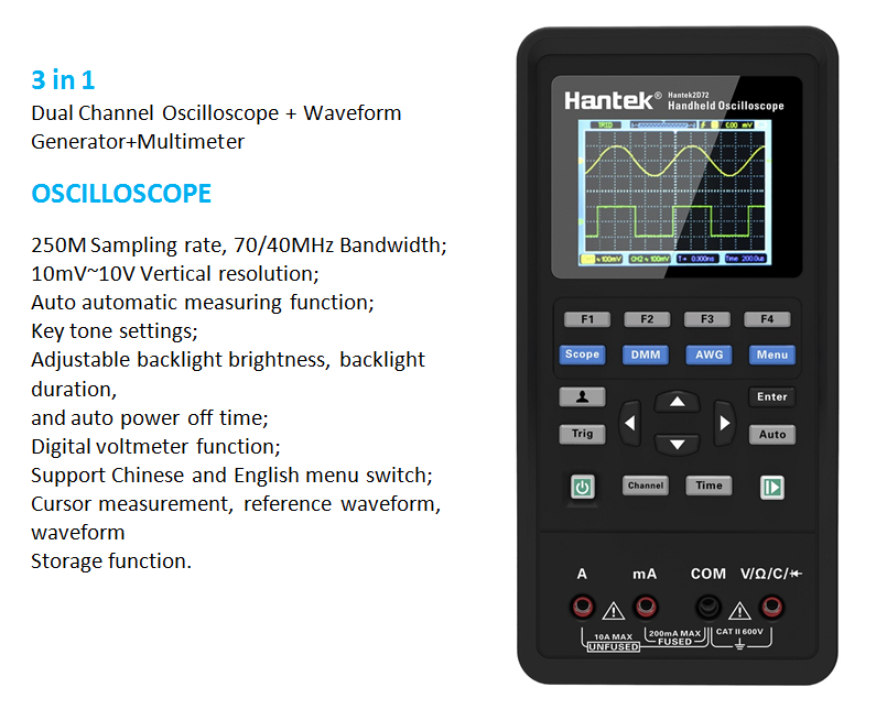 Серия Hantek 2000 имеет 2 канала с полосой пропускания 40 МГц или 70 МГц,
