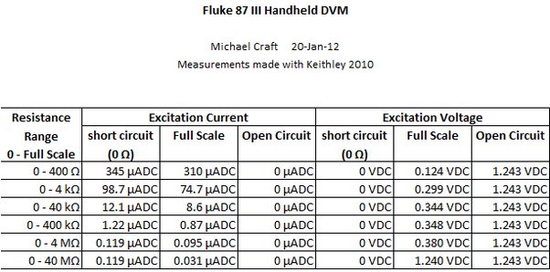 Ниже приведены некоторые измерения, которые я провёл с помощью портативного мультиметра Fluke 87. Например, в диапазоне от 0 кОм до 40 кОм мультиметр подаёт ток около 10 мкА, а затем измеряет напряжение на нагрузке. В диапазоне от 0 МОм до 4 МОм мультиметр подаёт ток около 0,1 мкА, а затем измеряет напряжение на нагрузке.