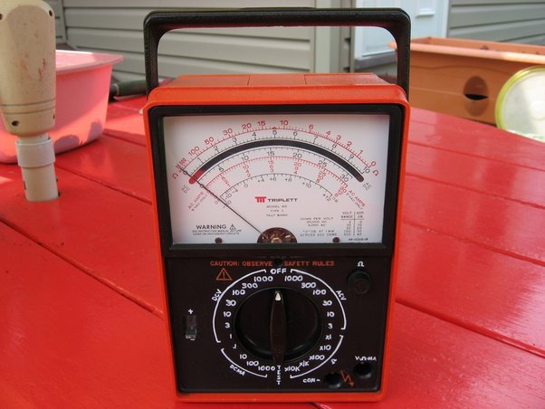 Аналоговые измерители используют подвижную катушку и печатную шкалу. В самых простых измерителях, таких как классический Simpson 260, измеритель имеет механизм с сопротивлением 20 000 Ом на вольт, что означает, что для отклонения стрелки измерителя на полную шкалу требуется 50 мкА. При шкале 10 В нагрузка цепи составляет 200 000 Ом. Это влияет на схему гораздо сильнее, чем 10 МОм цифрового измерителя.