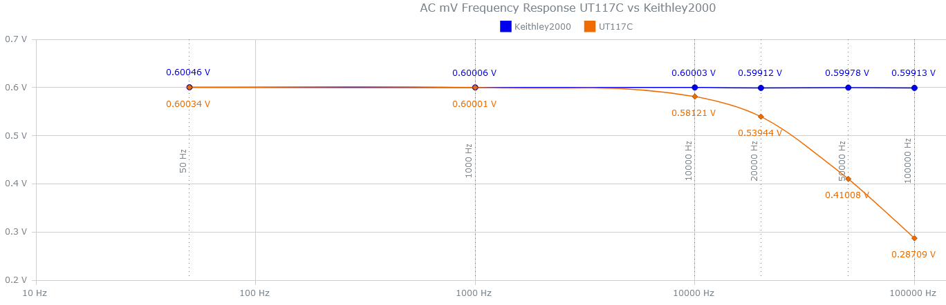 Частотная характеристика переменного тока в mV у UT117C и Keithley2000