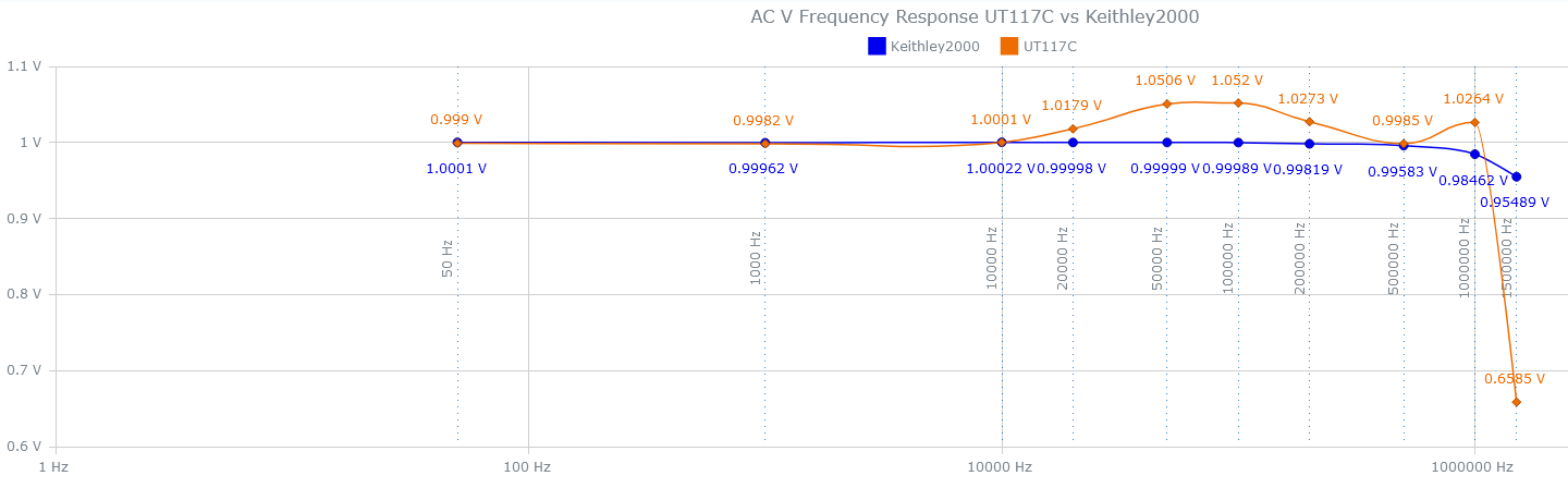 И сразу выпад (Германия): «Получил свой несколько дней назад. Continuity работает без каких-либо недостатков и очень быстро. Мне в целом нравится этот измеритель. Он станет моим любимым. Сверил его с некоторыми Keithley 2000, и на данный момент измерения UT117C точны». Далее: «Частота обновления измерений составляет 5 Гц. Частота обновления гистограммы составляет 20 Гц. Кстати: в руководстве пользователя (стр. 20) сказано: AC * Частотная характеристика: 45 Гц~1000 Гц. Я провел несколько тестов частотного диапазона: полоса пропускания AC TRMS, по-видимому, ограничена 1 кГц для диапазона AC mV и 10 кГц для диапазона AC V. Тем не менее, прибор точен в пределах 5% до 1 МГц».