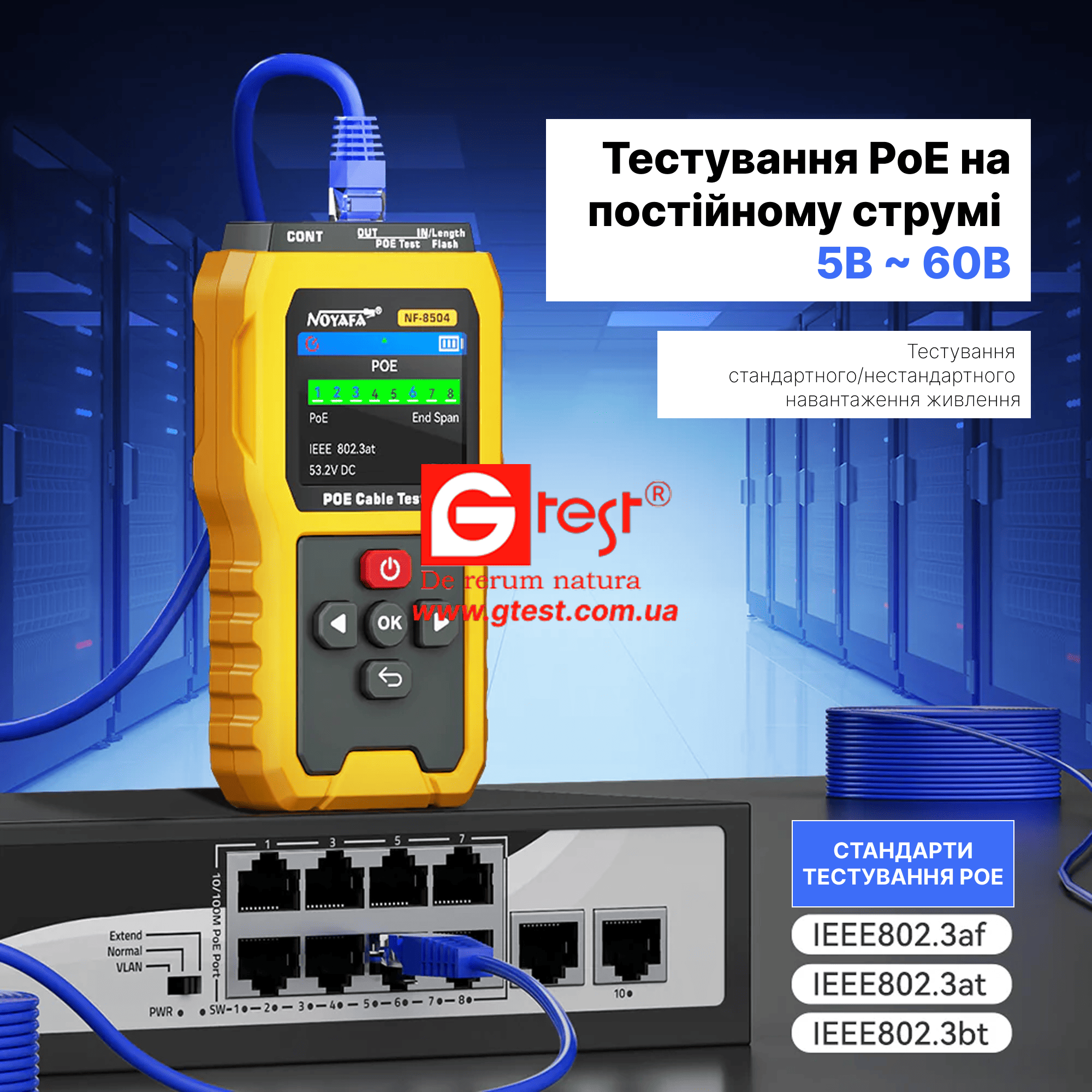 - Тестирование PoE (постоянный ток 5–60 В): поддержка стандартов IEEE802.3af/at/bt и нестандартных нагрузок; обеспечивает безопасную подачу питания PoE.