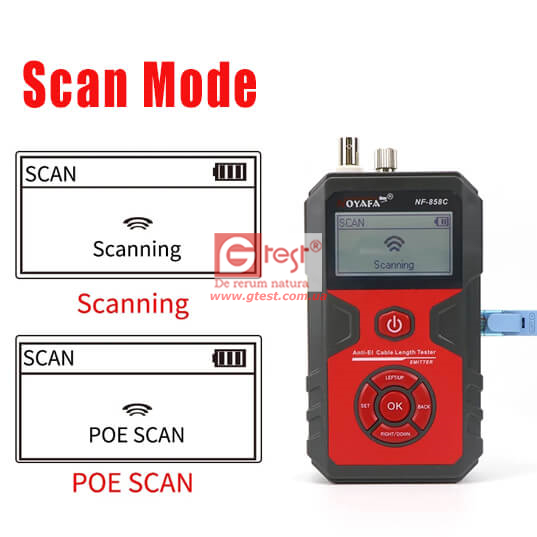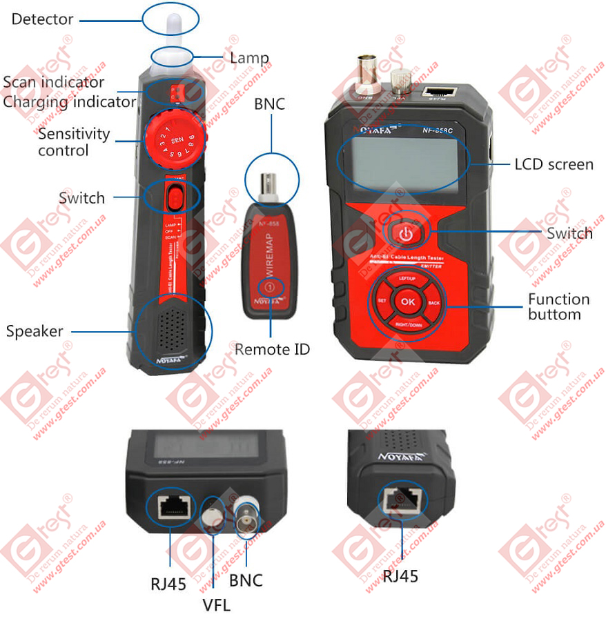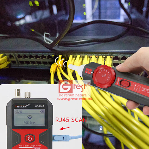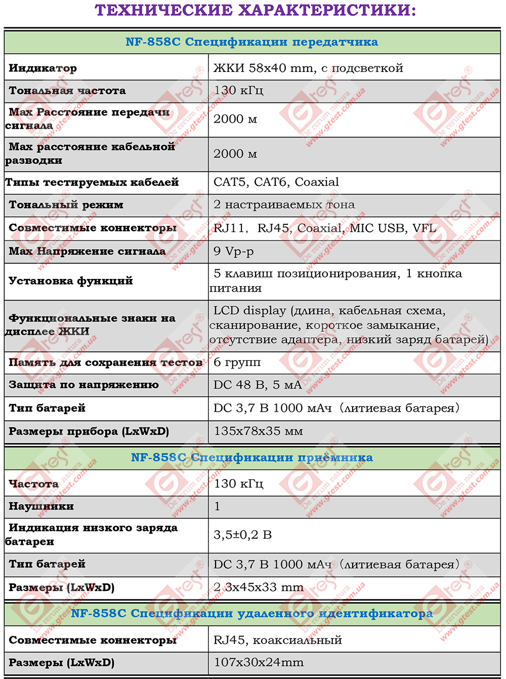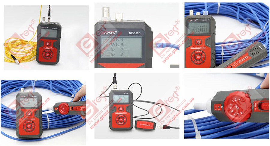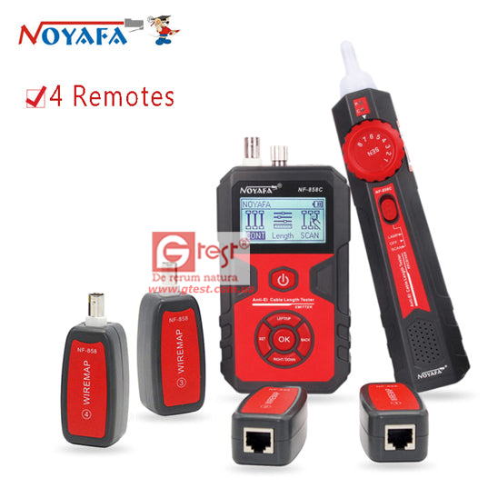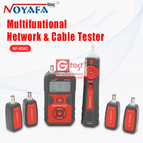 Кабельный тестер NF858С предназначен для трассировки скрытой проводки, поиска обрывов и коротких замыканий, измерения длины кабеля тестирования RJ-45, BNC, RJ-11 соединений и состоит из Передатчика, Приемника и четырех удаленных идентификаторов. Отличительной особенностью кабельного тестера NF858С является наличие выхода оптического генератора видимого диапазона VFL (Visual fault locator) для выявления повреждений оптических кабелей связи, а также тестирования телефонных линий, определения их статуса и полярности.