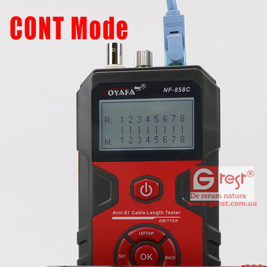 Вставьте кабель RJ45 и запустите режим CONT. Схема проводов будет доступна через 3 секунды. Легкое определение на предмет имеется ли в кабеле обрыв, короткое замыкание или пересечение.