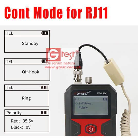 Подключите кабель RJ11 к NF-858C через прилагаемый адаптер RJ11-BNC. Определите непрерывность и состояние домашней телефонной сети.