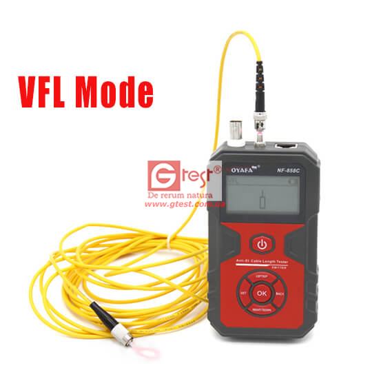 Вставьте оптоволоконный кабель и активируйте VFL на NF-858C. Красный свет укажет точное местоположение точки неисправности.