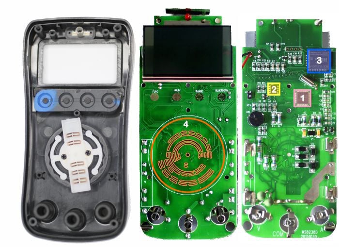Центральное изображение выделяет медные кольца (4), которые создают поворотный переключатель выбора. Правое изображение выделяет важные микросхемы на плате (от 1 до 3).