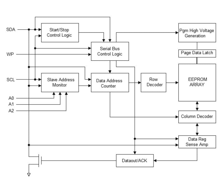 Это двухкилобайтная I²C EEPROM, которая хранит информацию о конфигурации для главного микроконтроллера. Она сопровождает ИС мультиметра DTM0660 так часто, что ее присутствие позволяет любителям и хакерам предполагать наличие схемы DTM0660 под эпоксидной смолой недорогих конструкций мультиметра на плате.