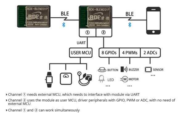 Этот определенно небольшой модуль объединяет радио Bluetooth Low Energy (BLE), программный стек Bluetooth и микроконтроллер 8051. Он имеет 23 универсальных входных/выходных контакта, 8 КБ ОЗУ, 128 КБ флэш-памяти и поддерживает один интерфейс I²C и два интерфейса USART.