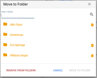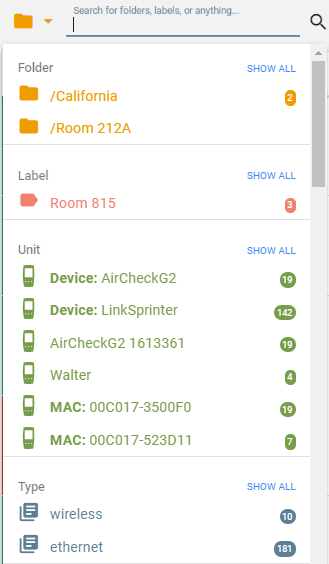 Нажмите на поле поиска, и вам будет предоставлено раскрывающееся меню с опциями поиска по папке, метке, устройству, типу, POE, скорости, IP-адресу и т. д. Если информация публикуется в Link-Live, то она доступна для поиска. Помните, что справа от опции ОЧИСТИТЬ вы увидите выбранные вами фильтры. Нажмите Очистить, чтобы вернуться ко всем результатам, или нажмите X рядом с фильтром, который вы хотите удалить.