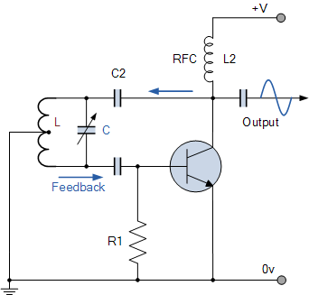 Часть обратной связи настроенной цепи LC-резервуара берется от центрального отвода катушки индуктивности или даже от двух отдельных катушек, включенных последовательно, которые включены параллельно с конденсатором переменной емкости C, как показано.