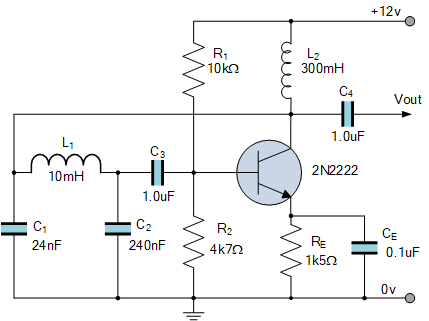 Конфигурация транзисторного усилителя представляет собой усилитель с общим эмиттером с выходным сигналом, смещенным на 180o по фазе относительно входного сигнала. Дополнительный сдвиг фазы на 180o, необходимый для колебаний, достигается тем, что два конденсатора соединены вместе последовательно, но параллельно с индуктивной катушкой, в результате чего общий сдвиг фазы схемы равен нулю или 360o.