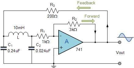 Обратите внимание, что, будучи конфигурацией инвертирующего усилителя, отношение R2/R1 устанавливает усиление усилителей. Минимальное усиление 2,9 требуется для запуска колебаний. Резистор R3 обеспечивает необходимую обратную связь с LC-контуром. Преимущества генератора Колпитца перед генераторами Хартли заключаются в том, что генератор Колпитца создает более чистую синусоидальную форму сигнала из-за низкоомных путей конденсаторов на высоких частотах. Также из-за этих свойств емкостного реактивного сопротивления генератор Колпитца на основе полевого транзистора может работать на очень высоких частотах. Конечно, любой операционный усилитель или полевой транзистор, используемый в качестве усилительного устройства, должен иметь возможность работать на требуемых высоких частотах.