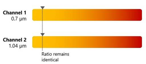 Двухцветный пирометр рассчитывает температуру по двум сигналам, используя метод нормирования. Нормируя сигнал двух детекторов, пирометр измеряет распределение цвета, а не только интенсивность сигнала. Это делает измерение независимым от факторов, влияющих на интенсивность сигнала, таких как загрязнения в воздухе между объектом и пирометром, такие как пыль, пар или дым. Для некоторых приложений это также означает, что на пирометр не влияют изменения излучательной способности, поскольку в обоих каналах происходит нейтральное изменение.