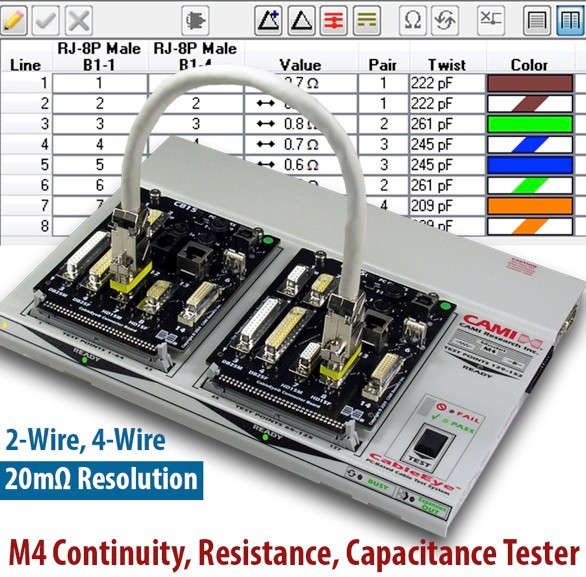 Много проводные тестеры непрерывности могут тестировать витые пары для проверки правильности взаимоотношений витых пар. Индикатор PASS показывает, что сопротивление проводов соответствует пороговому значению и что провода подключены правильно. Если введены целевое значение ёмкости и допуск, то значения, показанные в тестовых данных, находятся в пределах допуска ёмкости.