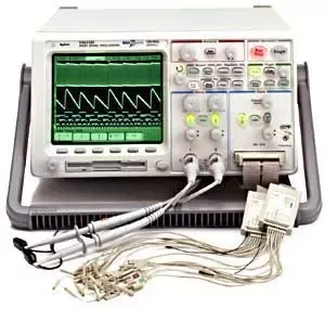 ЭЛТ — это технология отображения, которая может использоваться в любых осциллографах, даже в цифровых запоминающих осциллографах. Представляем осциллограф смешанных сигналов Agilent 54641D, по сути, высокопроизводительный цифровой запоминающий осциллограф (DSO) и логический анализатор, интегрированные в одном корпусе. Дисплей — зелёный ЭЛТ.