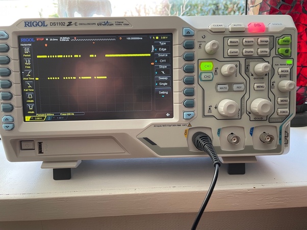 Моя рабочая лошадка — двухканальный осциллограф Rigol 1102 со множеством программных наворотов. Он действительно хорош, новый стоит меньше 300 фунтов.