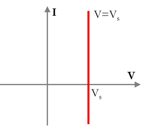 Рисунок 3. Кривая IV идеального источника напряжения представляет собой прямую линию, параллельную оси тока (I), т. е. независимо от тока, проходящего через устройство, напряжение не изменится.