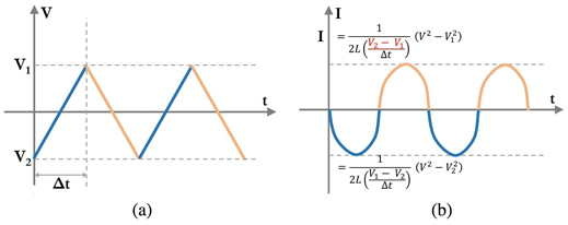 Рисунок 7 (а) Линейная развертка напряжения и (б) зависимость соответствующего тока дросселя от времени.