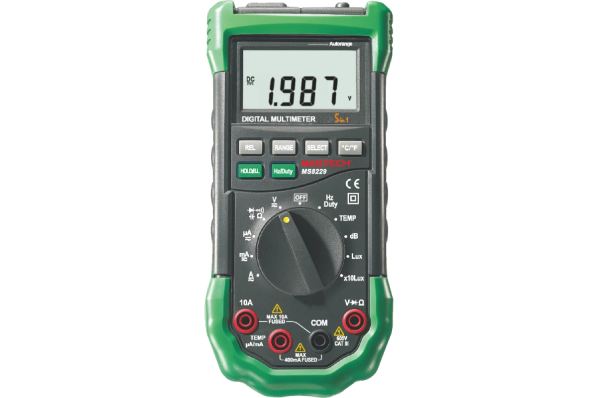 - Цифровой Мультиметр MS8229 способен осуществлять измерения переменного/постоянного напряжения, характеристик AC/DC тока, сопротивления, частоты, коэффициента заполнения, ёмкости, а также проверку целостности цепи и диодов.