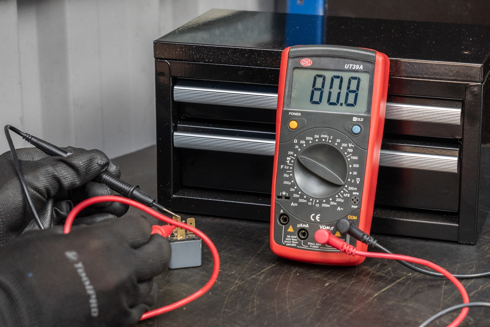 Затем вам нужно подключить контакт 30 к источнику питания 12 В, контакт 85 – к заземлению, а провод от контакта 86 – к источнику питания 12 В. Если вы услышите тихий щелчок, реле сработало. Чтобы проверить это, переключите мультиметр в режим измерения постоянного напряжения и, удерживая чёрный щуп на заземлении, коснитесь красным щупом контакта 87 или 87a. Если реле работает правильно, вы должны увидеть показания напряжения. Помните, что некоторые реле работают немного по-другому, поэтому крайне важно использовать правильную схему.