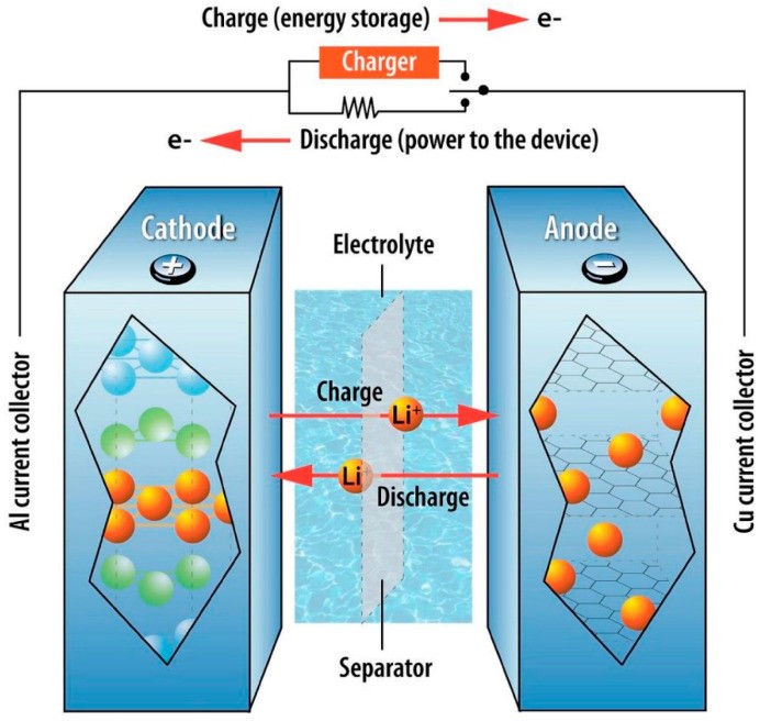 По мере роста популярности электромобилей (ЭМ) одновременно растет и спрос на литий-ионные аккумуляторы (ЛИА). Во многом это обусловлено их впечатляющим соотношением плотности энергии к весу (составляющим 120–220 Вт·ч·кг −1 [ 1 , 2 , 3 ]), что позволяет им превосходить другие технологии аккумуляторов, такие как свинцово-кислотные аккумуляторы (PbAB) и никель-металл-гидридные (NiMH) аккумуляторы [ 4 , 5 ]. Работая через стандартную систему анода и катода, простота заряда и разряда электронов из ионов Li + позволяет генерировать большие объемы энергии, как показано на рисунке 1 .